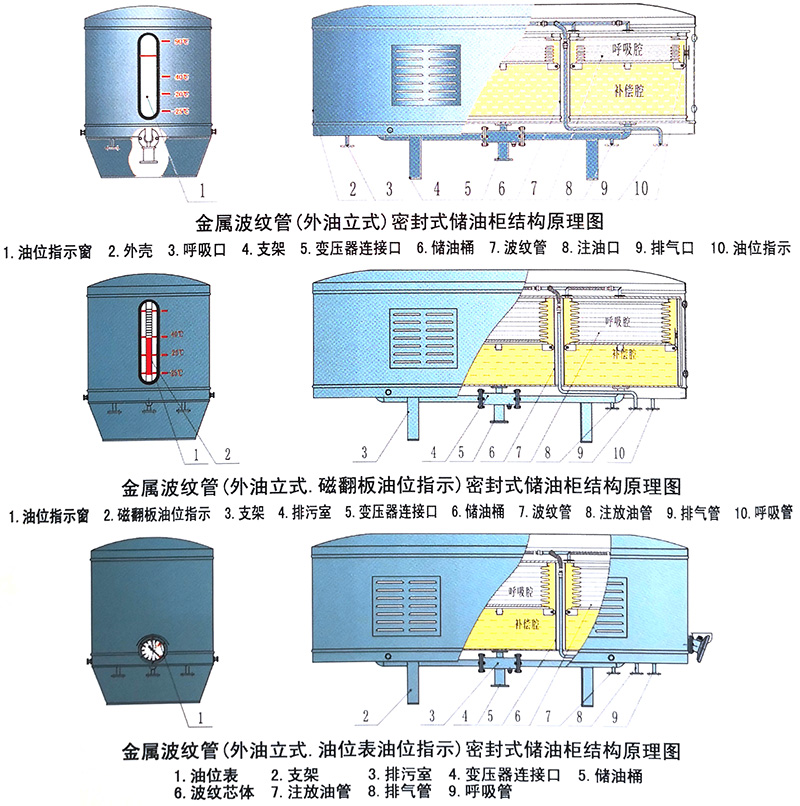 金屬波紋管(外油立式)密封式儲油柜,是我公司根據(jù)多年來用戶使用波紋儲油柜的意見和建議,研制生產(chǎn)的新一代儲油柜。它使用的是圓柱形波紋管芯體,實現(xiàn)變壓器油隨溫度變化的容積補償和油質保護。圓柱形波紋管,受力均勻,承壓能力強,不易失穩(wěn)變形。加工工藝簡單,更容易保證產(chǎn)品質量。該產(chǎn)品克服了外油臥式儲油柜運行時因受變壓器油重力影響受力不均,失穩(wěn)變形、出現(xiàn)卡滯、增大運行壓力等現(xiàn)象。和內(nèi)油式儲油柜比較,波紋芯體受儲油桶保護,運行更安全可靠。該產(chǎn)品油位指示采用窗式指示、磁翻板油位指示、傳統(tǒng)油位表油位指示。指示刻度直接標出,準確、直觀、便于觀察,同時改變了多年來用“油位-油溫曲線板”的習慣。各種油位指示均設有高低油位報警裝置,可根據(jù)用戶需要輸出4~ 20mA模擬信號。金屬波紋管外油立式儲油柜性能指標先進,技術成熟可靠,造型美觀大方,是儲油柜的換代產(chǎn)品。